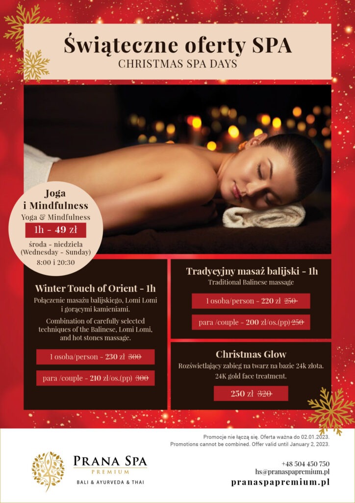 Świąteczne oferty SPA Strona głównaAktualnościŚwiąteczne oferty SPA środa, 30.11.2022 Święta tuż tuż! W wirze przygotowań nie zapominajmy jednak o sobie i zaplanujmy chwile odpoczynku i odprężenia. Na tę okazję przygotowaliśmy specjalne przedświąteczne promocje. poprzedni wpisŚlub na Bali następny wpisPoznajmy się